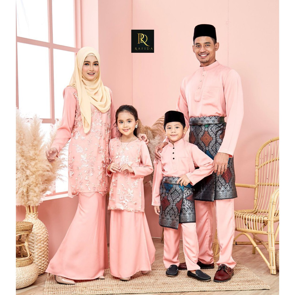 Ters set couple baju kurung brokat warna peach kemeja classic pink.